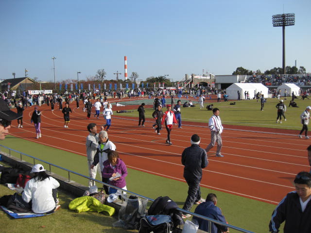 競技場に入って、脚をまっすぐにして大股で飛ぶようにする新しい走方で(笑)ゴールを目指していると、前方に、先ほど抜かれたジム友人夫婦の夫君が見えた。